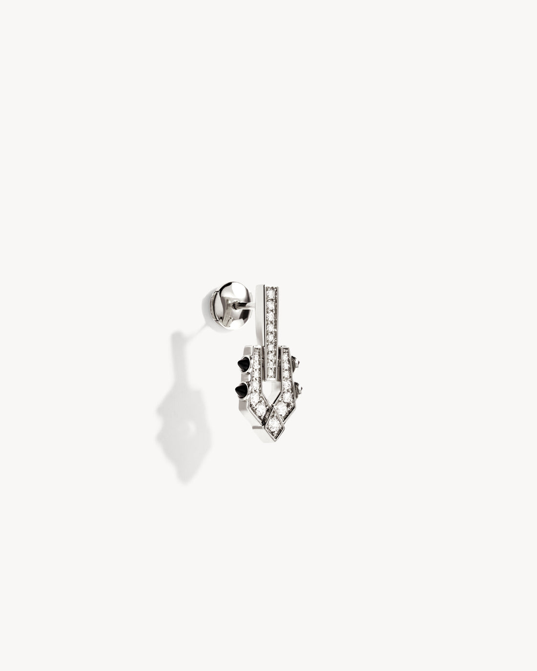 Earring in rhodium-plated silver, set with 22 brilliant-cut diamonds, G-VS quality, totalling 0.25 carat, with black agate spikes. Sold individually.