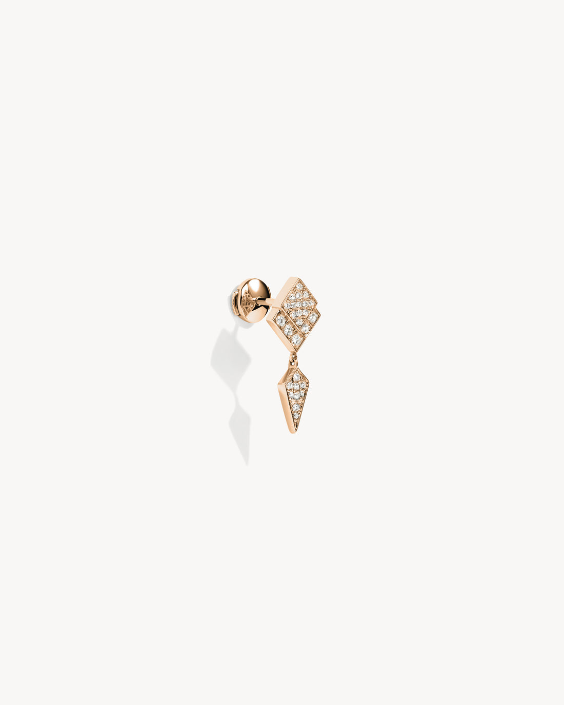 This diamond-shaped Stairway earring with a rose gold tip is set with 29 natural diamonds.