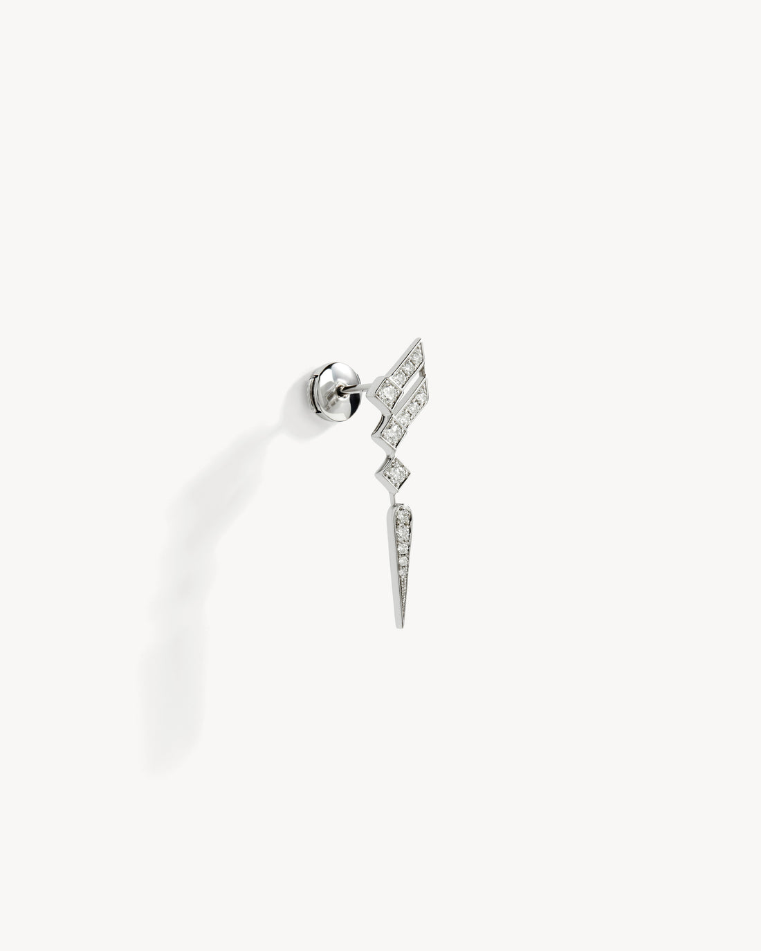 This wing-shaped earring in rhodium plated 925 silver paved with natural diamonds is inspired by the structural perspectives of living beings and contemporary architecture.
