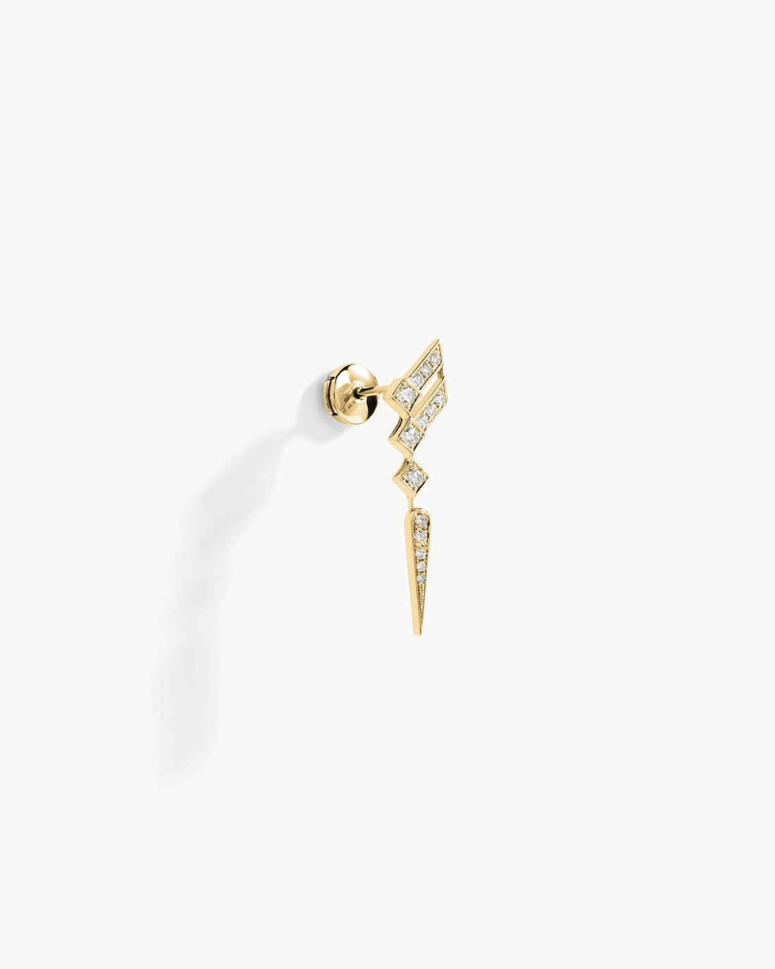 This 18k yellow gold wing-shaped earring paved with natural diamonds is inspired by the structural perspectives of living beings mixed with contemporary architecture.