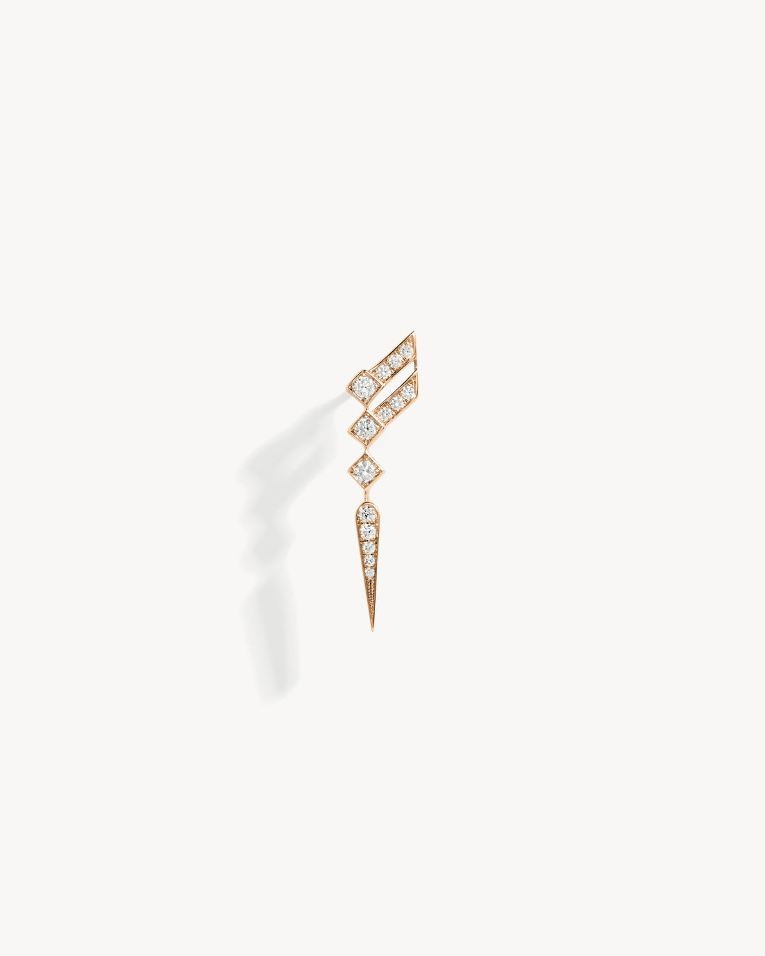 This 18-carat pink gold wing-shaped earring, set with natural diamonds, draws inspiration from the structural perspectives of living beings combined with contemporary architecture.