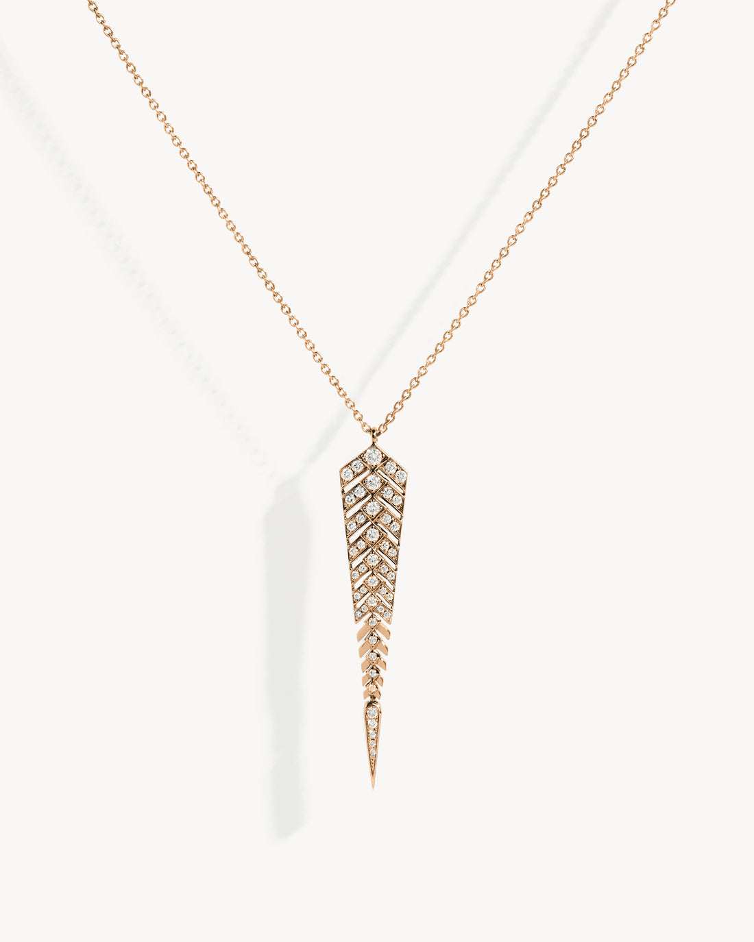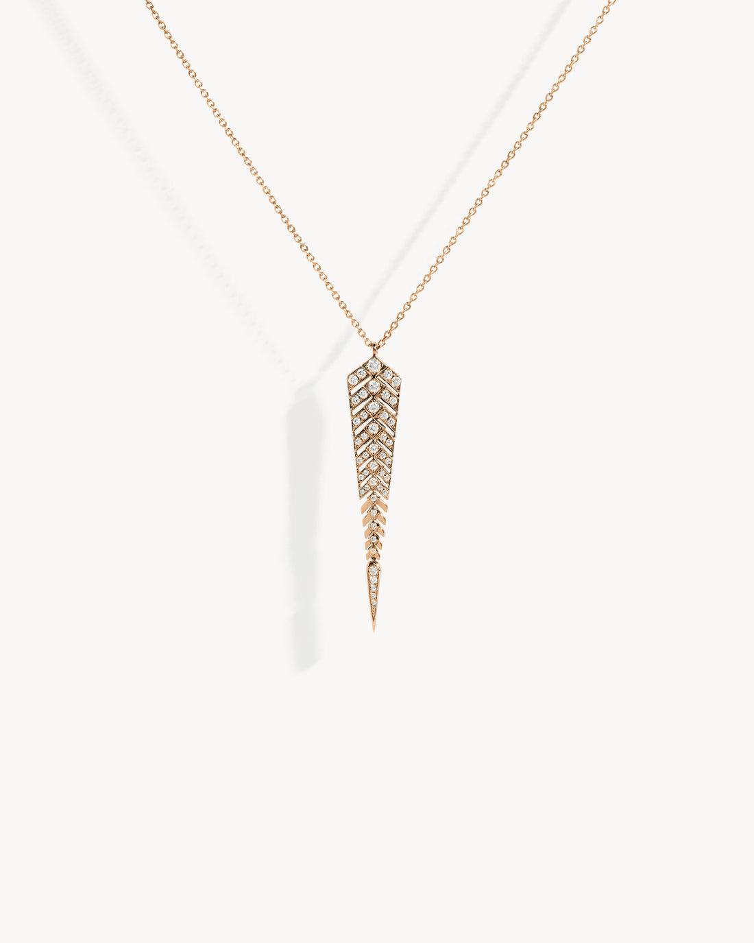 The Stairway M Necklace in Pink Gold & Diamonds features a pointed pendant in pink gold set with natural diamonds. It draws inspiration from the structural perspectives of living beings, intertwined with contemporary architecture.