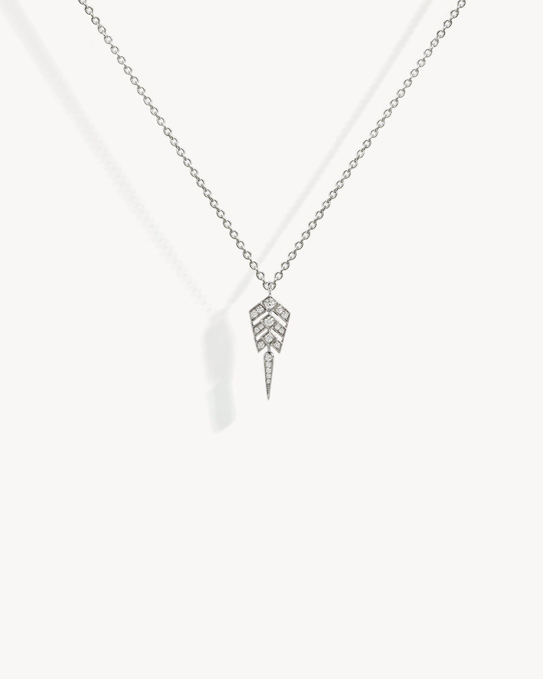 This rhodium plated sterling silver necklace paved with natural diamonds is inspired by the structural perspectives of living beings mixed with contemporary architecture.
