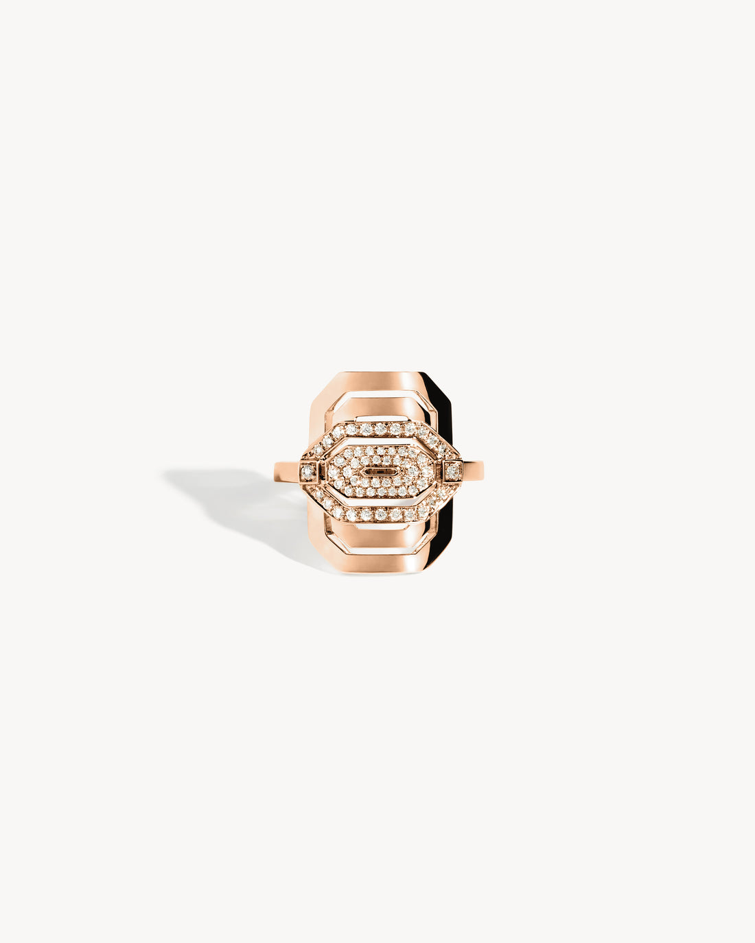 Ses contours au raffinement sculptural révèlent un motif en or rose 18 carats, pavé au centre de 58 diamants naturels.