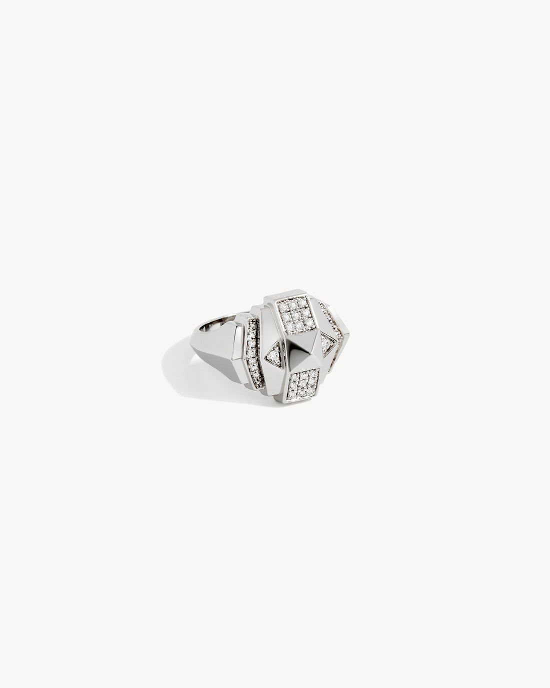 Les angles et volumes de la bague Rockaway Mini Pyramide révèlent un jeu d'ombres et de lumière.