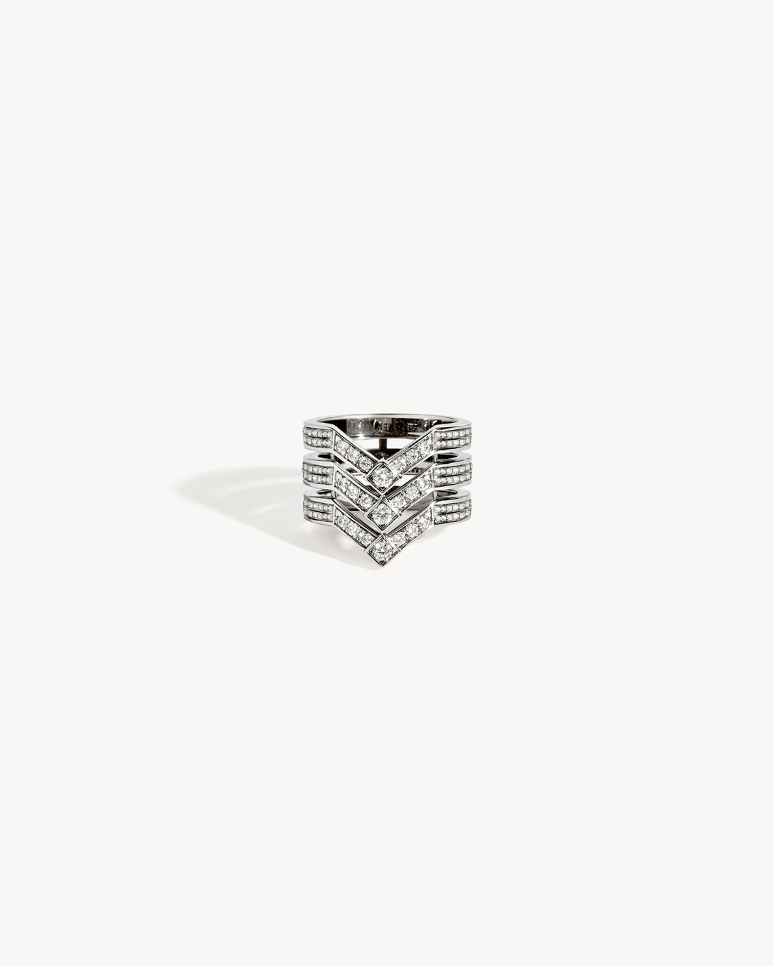 Les contours de la bague Stairway 3 Rangs s’inspirent des perspectives structurelles des êtres vivants mêlées à l’architecture contemporaine.