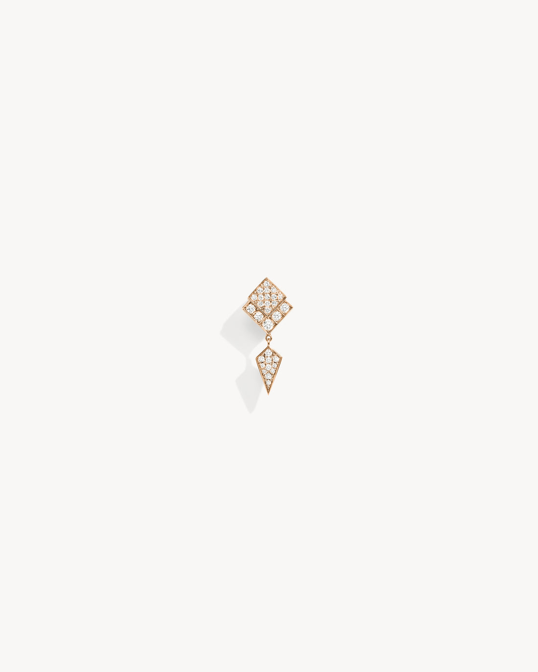 Cette boucle d'oreille Stairway en forme de losange doté d'une pointe en or rose est parcourue de 29 diamants naturels.