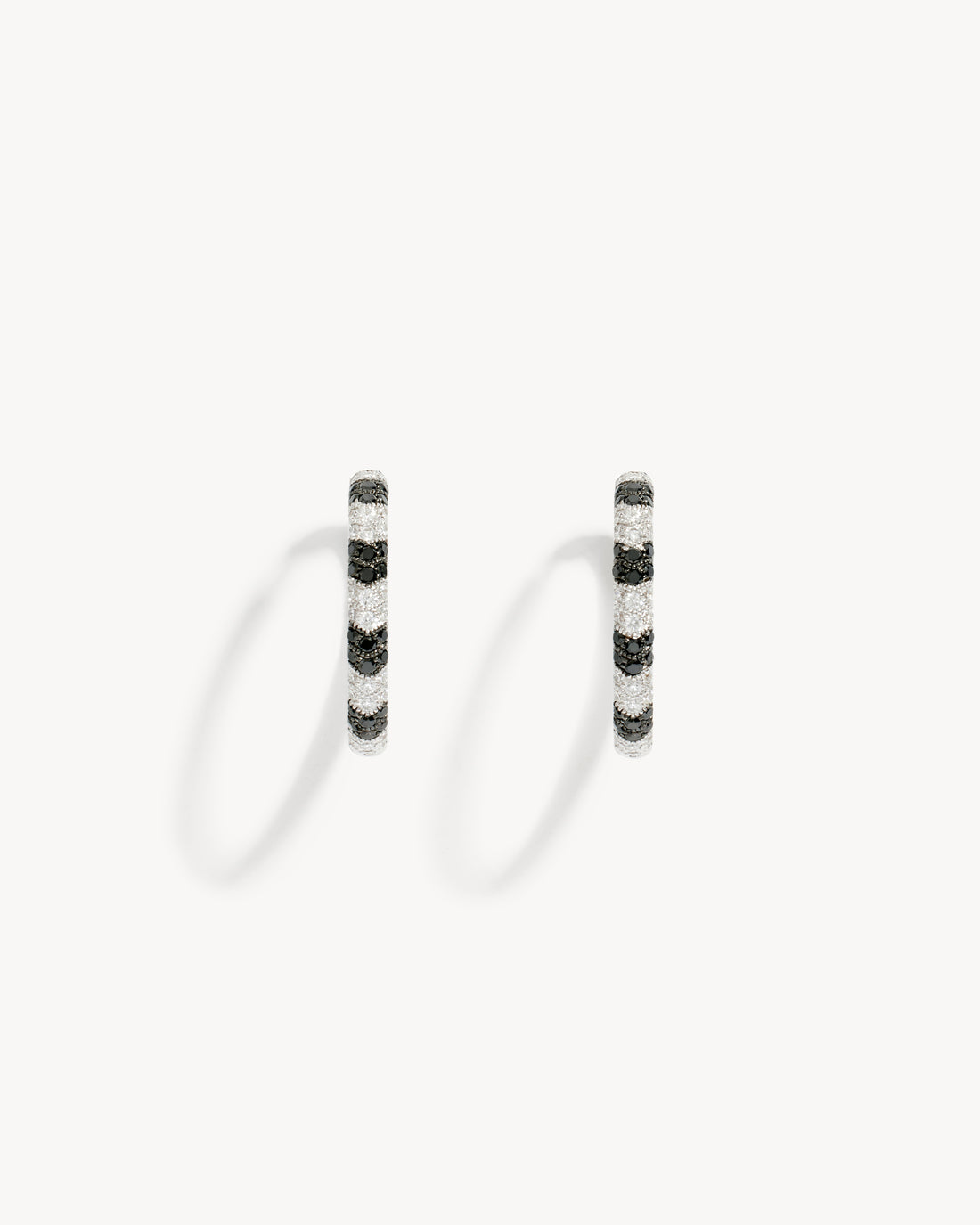 Créoles en or blanc 18 carats, pavées de 212 diamants blancs et noirs taille brillant, pour 2.7 carat. Vendues en paire.