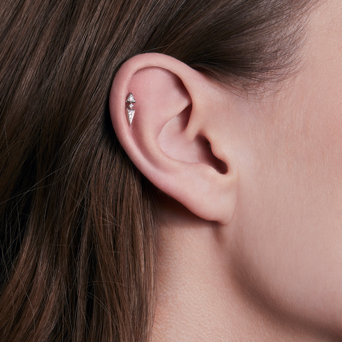 En or blanc 18 carats, ce piercing serti de quatre diamants représente deux triangles qui se se font face Le triangle est l'une des formes géométriques universelles et symbole d'équilibre.